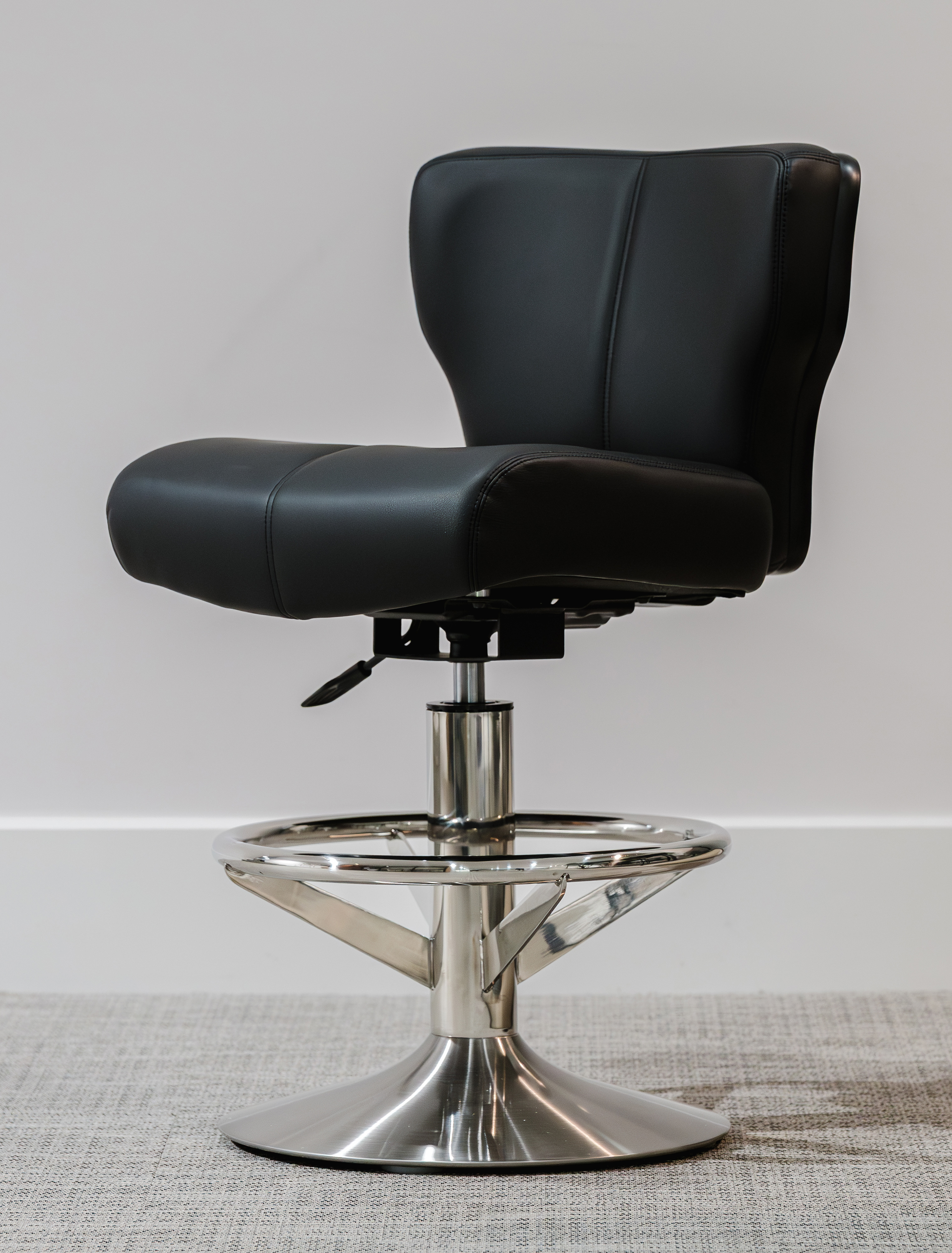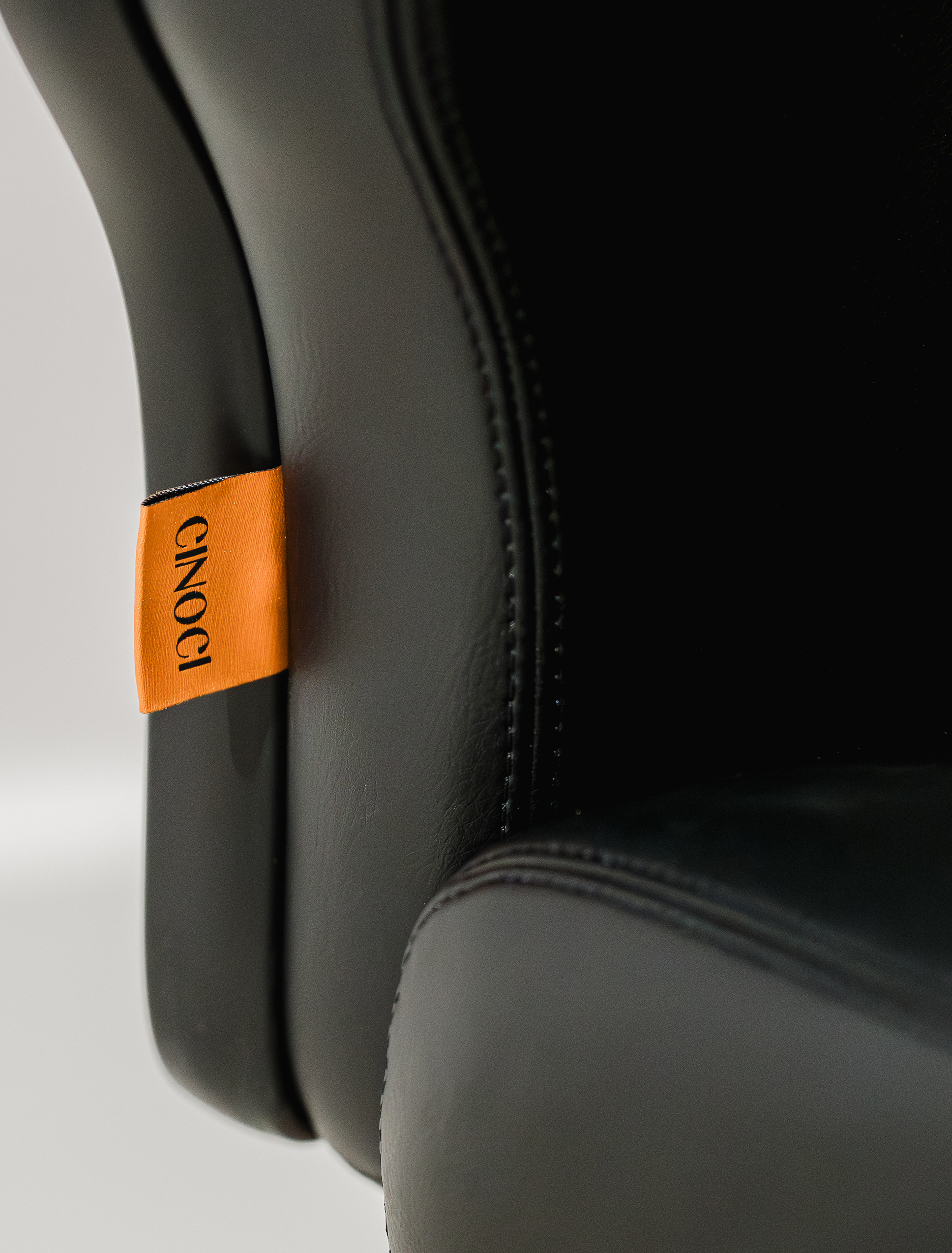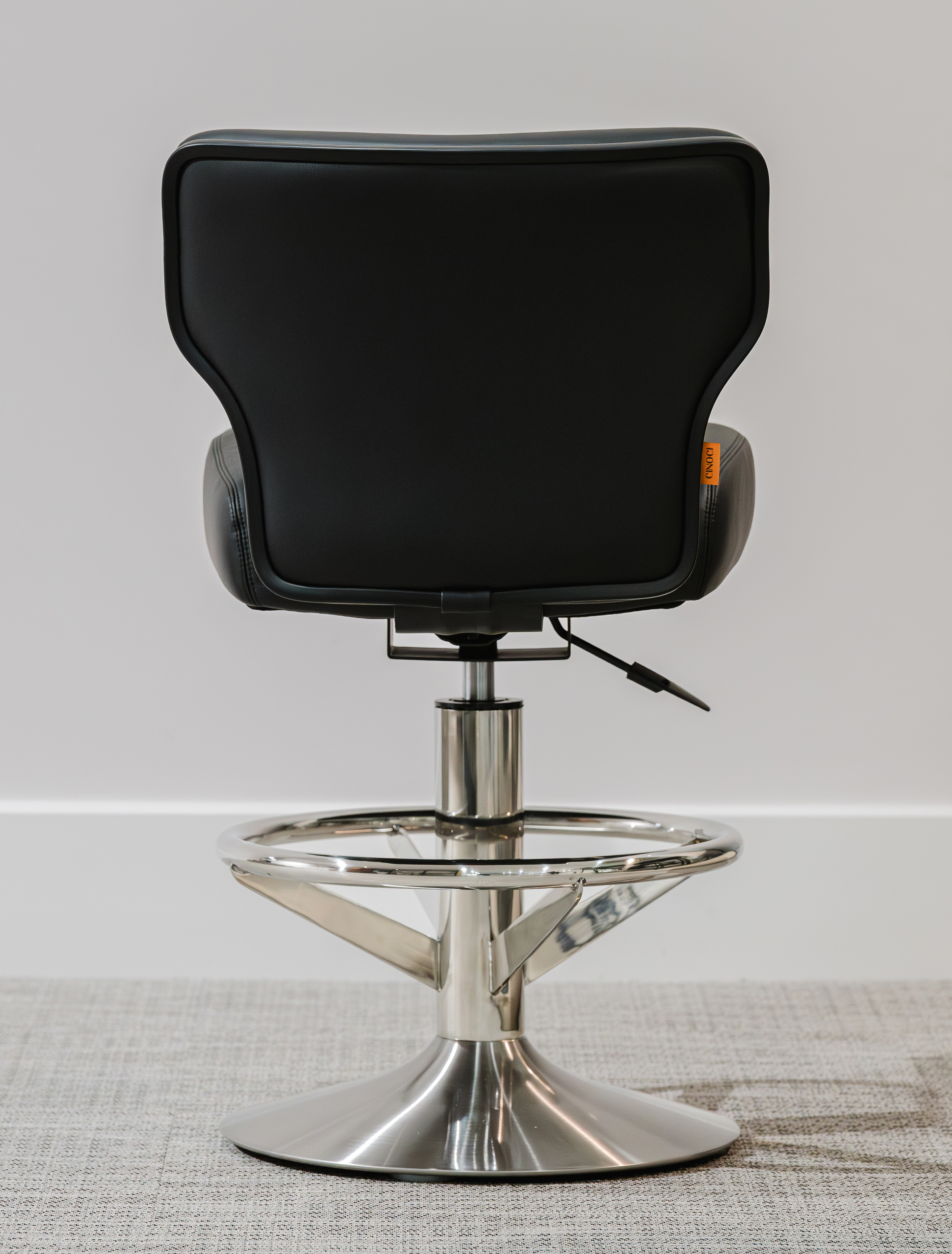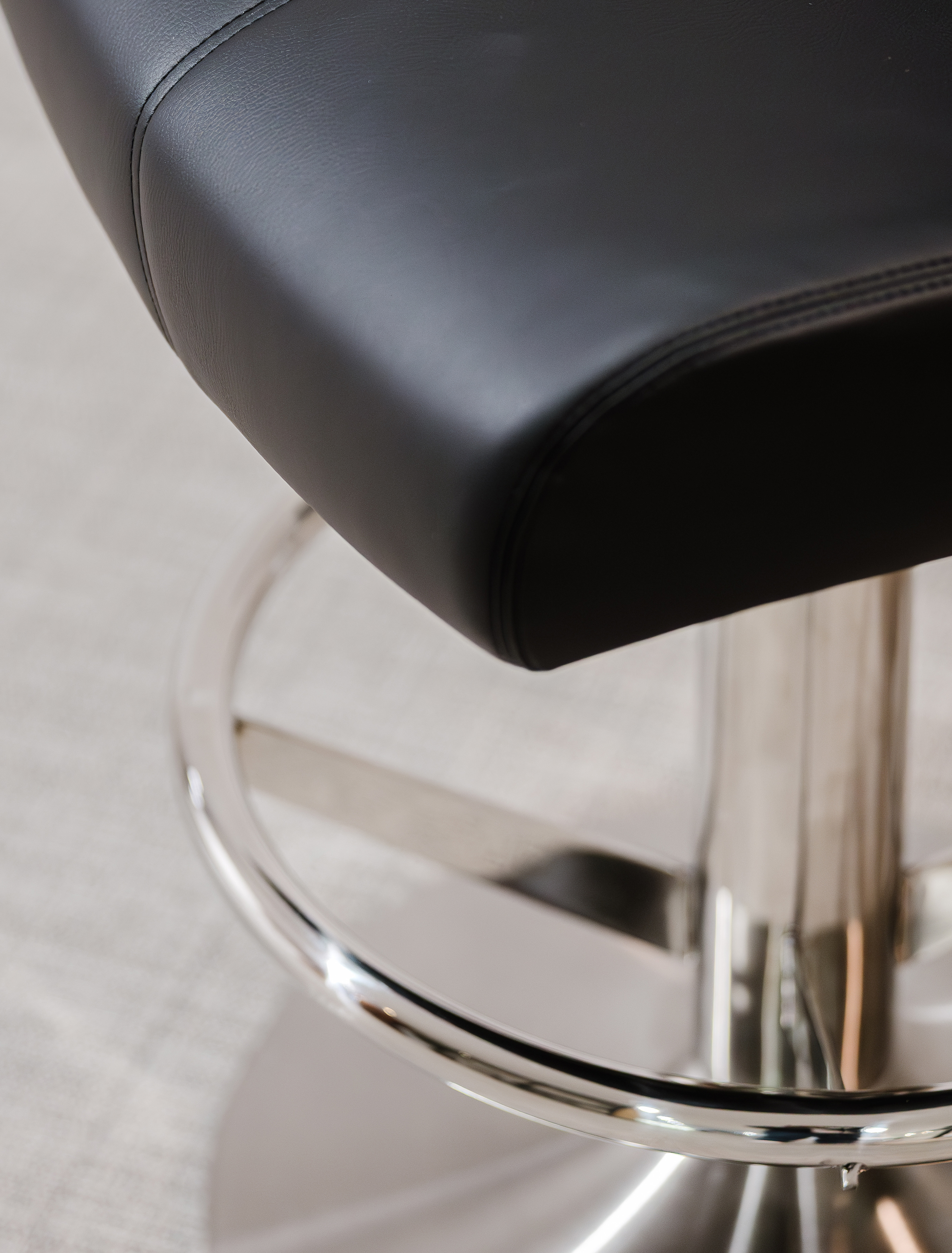 (The sample chair shown in the above images is finished in Cinoci's specialist black microfibre hybrid vinyl with a matching black stitch pattern, complimented by a contrasting stainless steel pedestal base pedestal base with matching foot rail)