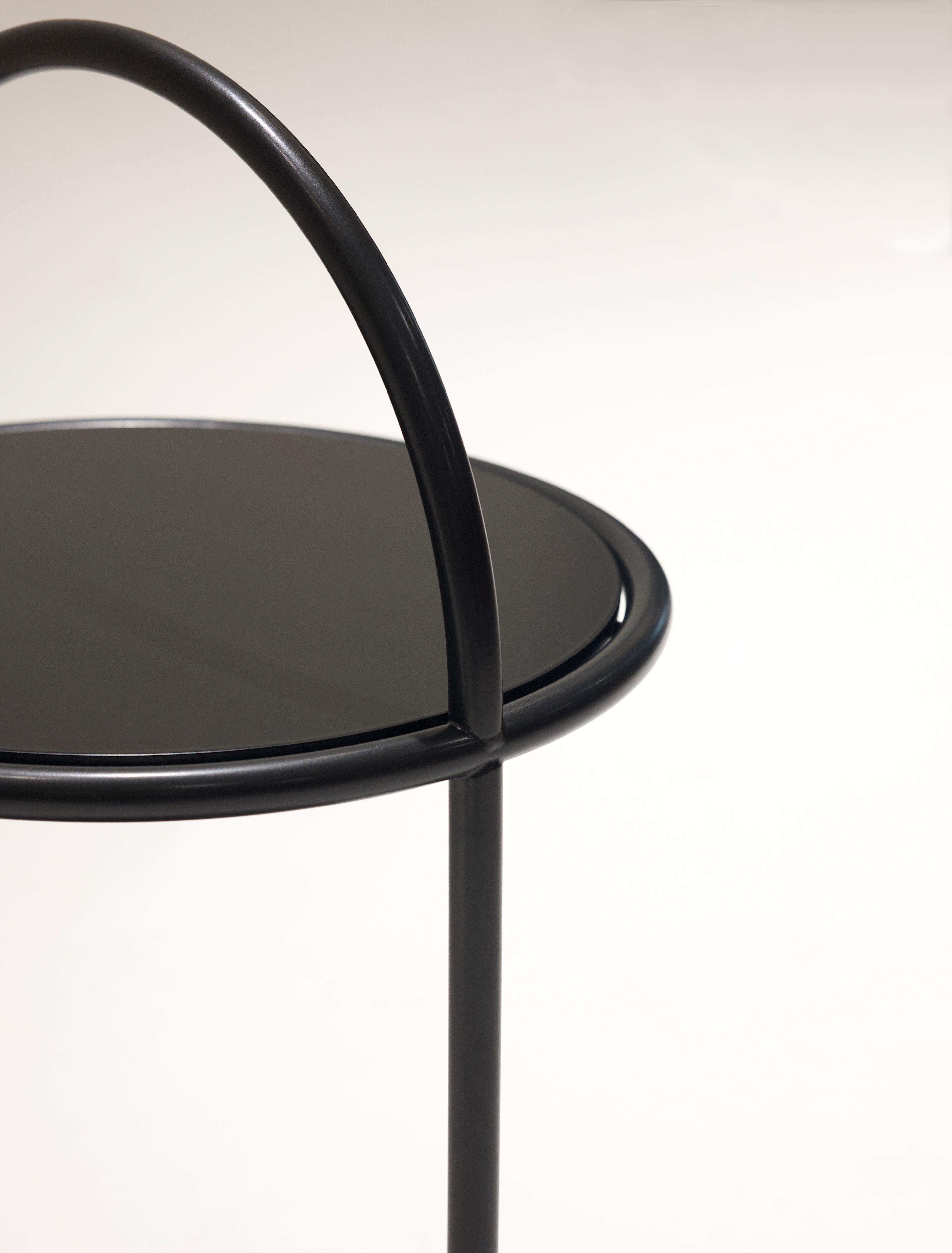 (The sample tables featured in the above images are finished in a satin black powder coat paint with a matching satin black textured laminate top shelf)